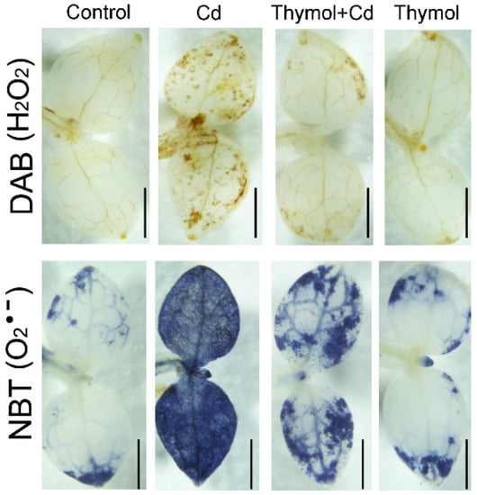The effect of thymol on the generation H2O2 and O2•− in the leaves of tobacco seedlings under Cd stress. The roots of seedlings were treated with water (control), CdCl2 (20 μM), CdCl2 (20 μM) + thymol (100 μM), and thymol (100 μM) for 72 h. After treatment, the seedlings were excised at the base of the stem and supplied DAB or NBT for 6 h through the cut stems. Then the leaves were decolorized with ethanol and photographed with a stereoscopic microscope. Bar = 1 mm.