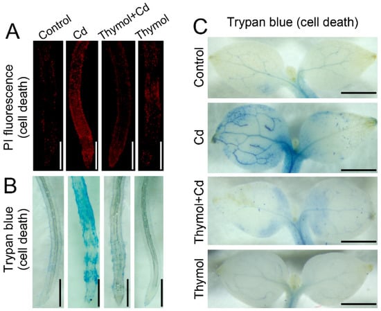 The effect of thymol on cell death in tobacco seedlings under Cd stress. The roots of seedlings were treated with water (control), CdCl2 (20 μM), CdCl2 (20 μM) + thymol (100 μM), and thymol (100 μM) for 72 h. (A) The roots were loaded with PI and photographed with a fluorescent microscope; (B) The roots were stained with trypan blue and photographed with a stereoscopic microscope; (C) The seedlings were excised at the base of the stem and supplied trypan blue for 6 h through the cut stems. Then the leaves were decolorized with ethanol and photographed with a stereoscopic microscope. Bar = 1 mm.