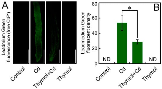 The effect of thymol on free Cd2+ in the roots of tobacco seedlings under Cd stress. The roots of seedlings were treated with water (control), CdCl2 (20 μM), CdCl2 (20 μM) + thymol (100 μM), and thymol (100 μM) for 72 h. Then the roots were loaded with Leadmium™ Green AM for the observation of green fluorescence (A) and the quantification of fluorescent density (B). Bar = 1 mm. The asterisk in (B) indicates that the mean value of three replicates was significantly different between thymol + Cd treatment and Cd treatment alone (p < 0.05).