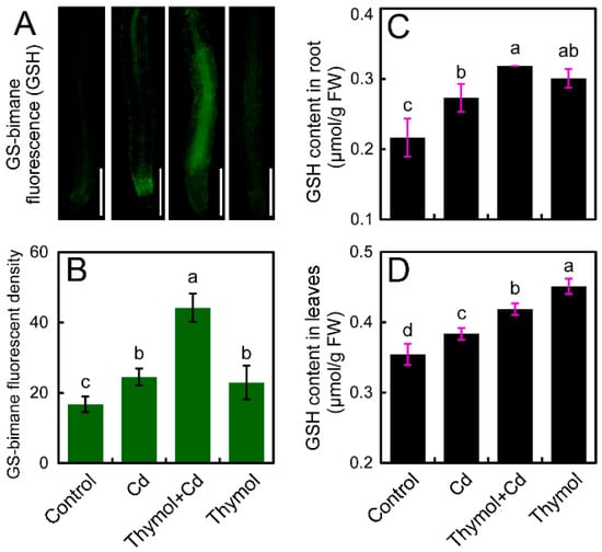 The effect of thymol on GSH content in tobacco seedlings under Cd stress. The roots of seedlings were treated with water (control), CdCl2 (20 μM), CdCl2 (20 μM) + thymol (100 μM), and thymol (100 μM) for 72 h. Then the roots were loaded with monochlorobimane for the observation of green fluorescence (A) and the quantification of fluorescent density (B). Bar = 1 mm. The GSH content was determined by in-tube assay in roots (C) and leaves (D), respectively. Different letters in (B–D) indicate that the mean values of three replicates are significantly different between the treatments (p < 0.05, ANOVA, LSD).