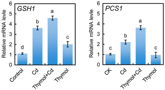 Real-time reverse transcription-polymerase chain reaction (RT-PCR) was selected to detect the expression of GSH1 and PCS1 in the roots of tobacco seedlings upon different treatments. Cd treatment stimulated the expression of GSH1 and PCS1 in roots. The addition of thymol still induced the upregulation of the expression of GSH1 and PCS1 in Cd-treated roots (Figure 8).