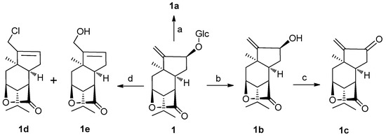 Conversion of 1 into picrotoxane sesquiterpenes 1a–e. Reagents and conditions: (a) acetic anhydride, pyridine, r.t.; (b) citrate buffer, β-glucocidase, rt; (c) Dess–Martin periodinane (DMP), DCM, r.t., 40 min; (d) 4 N HCl-dioxane (1:1), 100 °C, 2 h.