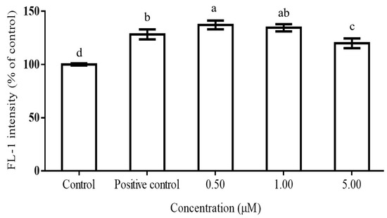 Inhibition of ROS production by gallic acid in phorbol ester-induced macrophage RAW264.7 cells. The cells were activated by PMA at 0.10 μg/mL concentration for 30 min (positive control). Gallic acid at different concentrations (0.50, 1.00 and 5.00 µM) were added to 1 × 106 macrophage cells for 24 h prior to PMA activation. ROS levels were expressed as DCF intensity, measured in the FL-1 mode of flow cytometer, mean ± standard deviation. This assay was performed with three replicates for each treatment. Different letters indicate the significant difference in each group with other treatments (p < 0.05, Duncan test).