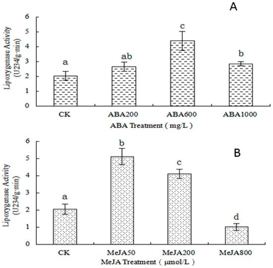 2.3. Effect of Exogenous ABA and MeJA on Fatty Acid Composition and LOX Activity