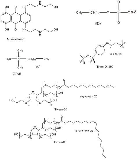 As the surfactant micelles can be used as drug carriers and simplified model membranes in order to obtain information about the interaction with biological membranes, a systematic investigation of the interaction of mitoxantrone with anionic (SDS) [41], cationic (CTAB) [42] and non-ionic (Triton X-100, Tween-20, Tween-80) [43] surfactants has been performed. Ionic micelles were chosen as a model of the lipid bilayer in order to investigate the electrostatic contribution to the drug binding (the influence of different charges at the polar surfactant head groups), while the non-ionic micelles were chosen in order to evaluate the hydrophobic contribution to mitoxantrone binding.