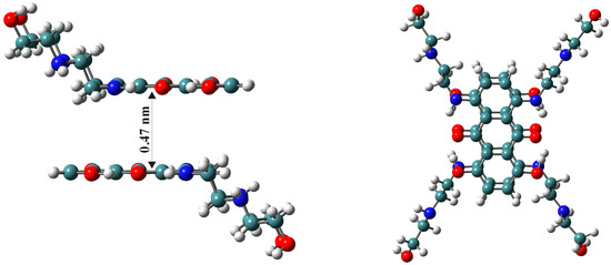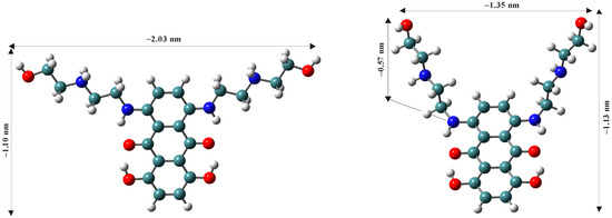In the mitoxantrone dimer geometrical arrangement (Figure 3), the planes of the drug chromophores are parallel to each other due to π-π stacking interactions and situated at 0.47 nm apart and this value is close to the distance between two pyrene molecules (0.42 nm) [57]. This geometric arrangement of mitoxantrone dimer in solution resembles the calculated structures proposed using NMR analysis [58].