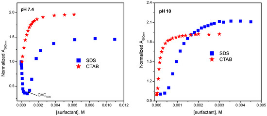 Variation of the monomer normalized absorbance at 660 nm with SDS and CTAB concentration at pH 7.4 and pH 10. (The figure was drawn based on references [41,42]).