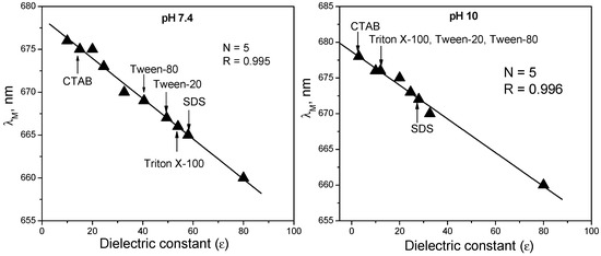 Absorption maxima of mitoxantrone monomer (λM) in different solvents (water, methanol, ethanol, propanol, tert-butanol) as a function of the dielectric constant at pH 7.4 and 10. The positions for the surfactant micelless at pH 7.4 and 10 are shown on the graphs (the figure was drawn based on the references [41,42,43]).