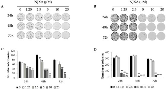NJXA inhibits the proliferation of cervical cancer cells. (A) HeLa and (B) SiHa cells were seeded in 6-well plates at 200 cells per well. After 24 h of growth, the cells were treated with NJXA (0~20 μM) for 24, 48, and 72 h. Then, the media were replaced with complete medium without drugs, and the cells were cultured for 14 days. The colony counts for (C) HeLa and (D) SiHa cells are presented. The data shown are the mean values ± SD. * p < 0.05, ** p < 0.01, *** p < 0.001 compared with the control. n = 3.
