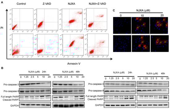 2.2. NJXA Induces Caspase-Dependent Apoptosis in HeLa and SiHa Cells