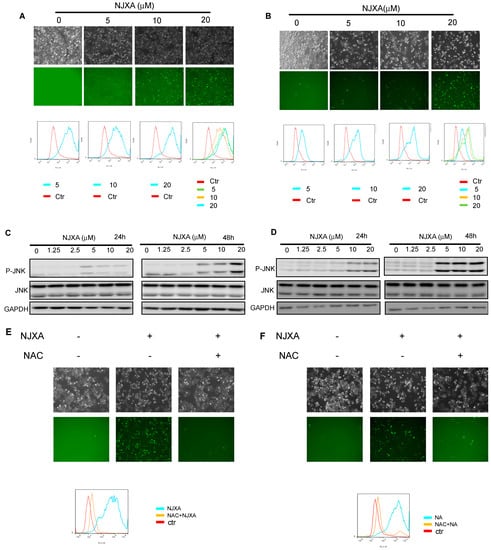 ROS are known to participate in regulating apoptosis [27] and to promote the activation of JNK by inhibiting MAP kinase phosphatases [28]. In our study, the level of intracellular ROS was measured using DCFH-DA. Fluorescence microscopy revealed that cells exposed to NJXA for 12 h had much brighter green fluorescence than did the cells in the control group (Figure 4A,B), indicating that NJXA induced the marked accumulation of intracellular ROS. Flow cytometric analysis also demonstrated that the level of intracellular ROS increased in a dose-dependent manner in the treated cells when the concentration of NJXA was increased from 0 μM to 20 μM. Because JNK is a stress response protein kinase that can be activated by ROS [29], we investigated the effect of NJXA on JNK in HeLa and SiHa cells. Western blotting analysis showed that the level of total JNK was not obviously changed after NJXA treatment compared with the level in the control cells, whereas NJXA treatment triggered the concentration-dependent upregulation of the level of phosphorylated JNK (Figure 4C,D). Moreover, pretreatment with the antioxidant NAC at 10 mM counteracted the increase in intracellular ROS that occurred in HeLa and SiHa cells exposed to NJXA (Figure 4E,F), as shown by fluorescence microscopic and flow cytometric analysis. The proportion of apoptotic cells was also decreased obviously in the presence of NAC or SP600125 in NJXA-treated cells (Figure 4G,H). At the same time, NAC effectively antagonized the phosphorylation of JNK in response to NJXA (Figure 4I). Therefore, these results indicate that ROS contributed to the NJXA-induced apoptosis of HeLa and SiHa cells.
