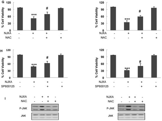 Cells were pretreated with 10 mM of NAC (Sigma, Taufkirchen, Germany,) or 20 μM of SP600125 (Cell Signaling Technology, Danvers, MA, USA) for 2 h, and then treated with NJXA (20 μM) for 24 h. After treatment, a 3-(4,5-dimethylthiazol-2-yl)2,5-diphenyltetrazolium bromide (MTT) solution was added and incubated for 4 h. After the medium was removed, 100 μL of DMSO was added, the absorbance was measured at 570 nm, and cell viability was normalized as the percentage of control.
