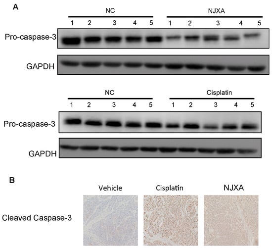 The antitumor effect of NJXA was examined in nude mice, as described previously [26]. Our previous results showed that NJXA treatment decreased both the volume and weight of the xenografted tumors compared with those in the control group and that the anticancer activity of NJXA was comparable to that of cisplatin [26]. To better understand the molecular mechanism underlying the effect of NJXA on tumorigenesis in vivo, we examined the expression level of pro-caspase-3 and the level of cleaved caspase-3 in tumor tissues using Western blotting and immunohistochemical analysis, respectively. As shown in Figure 5A, the expression levels of pro-caspase-3 were significantly lower in the tumor tissues of NJXA-treated mice than in those of the control mice, whereas the level of cleaved caspase-3 was dramatically increased. These results strongly indicated that NJXA inhibited the growth of cervical cancer in vivo by inducing apoptosis.