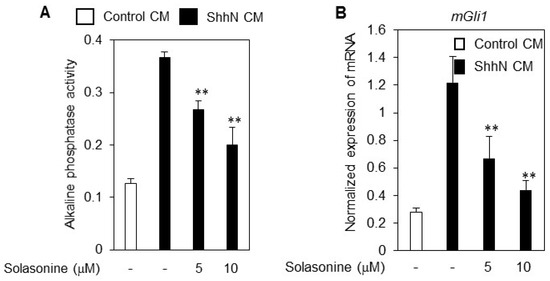 The mouse embryonic fibroblast line C3H10T1/2 is a mesenchymal stem cell line that can differentiate into adipocytes, chondrocytes, and bone osteoblasts [9,10]. The Hh signaling pathway may promote the differentiation of C3H10T1/2 cells into the bone cell lineage and ALP induction has been used as a marker for this process [11]. To further confirm the inhibitory effect of solasonine on the Hh signaling activity, we assessed the influence of solasonine on the ALP activity in C3H10T1/2 cells.
