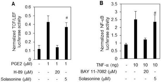 To rule out the possibility that solasonine nonspecifically inhibits Hh activity provoked by ShhN CM, we next examined the effect of solasonine on the activity of other transcriptional factors, such as NF-κB, and TCF/LEF [12]. The results showed that TNF-α and PGE2 obviously stimulated the NF-κB (Figure 3A), and TCF/LEF luciferase activity (Figure 3B). However, we observed that solasonine failed to exhibit inhibitory activity against either NF-κB (Figure 3A), or TCF/LEF luciferase activity (Figure 3B). The BAY 11-7082, and H89 were used as positives for inhibition of NF-κB (Figure 3A), and TCF/LEF luciferase activity (Figure 3B), respectively.