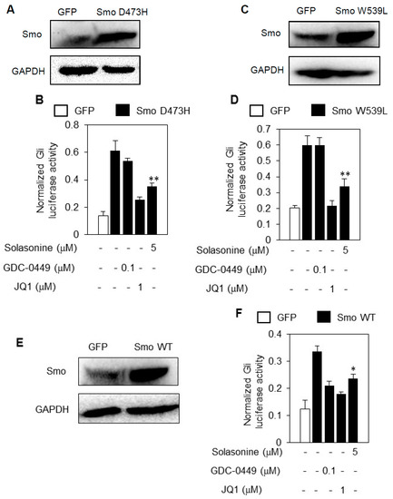 One of major molecular mechanisms underlying the primary and acquired resistance of current Smo inhibitors is gain-of-function mutations in their target Smo [14]. Having characterized Gli as the cellular target of solasonine, we then proceeded to determine whether solasonine may inhibit the aberrant Hh pathway activity caused by ectopic expression of Smo mutants SmoD473H (Figure 5A) or SmoW539L (Figure 5C), which both may cause resistance to the current Smo antagonists [5,6]. The results showed that treatment with solasonine robustly suppressed the Gli-luciferase activity provoked by artificially forced expression of Smo D473H (Figure 5B) or Smo W539L (Figure 5D) into light II cells, as does JQ1, a specific small molecular inhibitor of Gli [15].