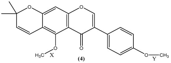 The pulverised plant material (4.5 kg) was extracted using cold percolation with petroleum ether (2 L) for five days at 27 °C. The extract was filtered and concentrated using rotary evaporator to give a brown solid (18 g) and stored in a refrigerator. In addition, 15 g of this solid were dissolved in chloroform, mixed with aluminium oxide and dried at 50 °C. This was placed on a column (50 mm × 1200 mm) pre-packed with aluminium oxide. The column was first eluted with petrol (500 mL), and then with a 5% increment of ethyl acetate in petrol, and 500 mL for each increment. At 45% of ethyl acetate in petrol, TLC profiling showed two dominant fractions F1a and F1b. These fractions were purified using column chromatography (CC) (20 mm × 600 mm) with aluminium oxide and an increasing amount ethyl acetate in petrol. Afterwards, the defatted plant material was also extracted with ethyl acetate (2 L) for a week at 27 °C. A yellow mixture (20 g) was obtained after solvent removal and also stored in a refrigerator. CC of 15 g of the yellow mixture was conducted as above. At 80% of ethyl acetate in petrol, TLC profiling showed four dominant fractions—F2a, F2b, F2c and F2d. These fractions were also purified on CC. The compounds were characterised by TLC, mass spectrometry, IR, 1H and 13C-NMR spectra and compared to published data. F1a and F2b were found to be the same compound and identified as isoflavone (4) (4.8 g). F1b and F2c were identified as isoflavones (3) (1.2 g) and (5) (23 mg), respectively. F2a and F2d were also identified as coumarin (1) (1.4 g) and (2) (642 mg), respectively.