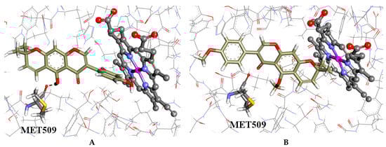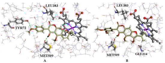 (A) the docked configuration of alpinumisoflavone (3) in the binding site of CYP51; and (B) the docked configuration of O,O-dimethylalpinumisoflavone (4) in the binding site. Hydrogen bonds are shown as green dotted lines.