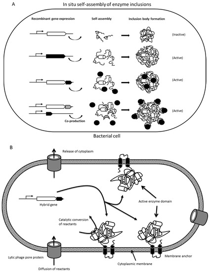In situ enzyme immobilization: (A) Different modes of protein assembly leading enzyme inclusions. Black shapes indicate the target enzyme; (B) Immobilization of target enzyme by genetic fusion of a membrane anchor domain. Production of a phage pore enables release of intracellular content while retaining a membrane vesicle with immobilized enzyme.