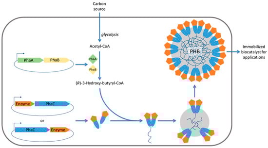As a means of energy storage under conditions of excess carbon source, various types of lipophilic compounds are deposited as insoluble cytoplasmic inclusions in a range of organisms [61,62]. Inclusions of polyhydroxyalkanoates (PHAs), such as poly(3-hydroxybutyrate) (PHB), are the most common prokaryotic inclusions, but others, such as triacylglycerol (TAG) inclusions, may also be present. Importantly, the hydrophobic core of these inclusions is generally surrounded by an amphiphilic protein shell [63]. Thus, by expressing genes encoding the respective inclusion-associating proteins, or PHA-binding domains, translationally fused to the enzyme desired for immobilization in an inclusion-producing bacterial strain, one-step production of the immobilized biocatalyst was achievable [64]. Engineered PHA inclusions coated with functional protein were recently demonstrated to be applicable for medical applications such as in diagnostics and as vaccine [65] (Figure 3).