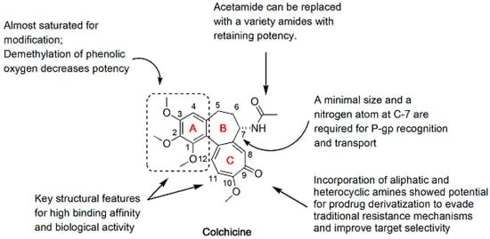 Colchicine (1), a natural product extracted from Colchicum autumnale, has been used to treat acute gout. Although colchicine (1) is a powerful antimitotic agent, the use of colchicine in cancer chemotherapy is hampered by its toxicity and the development of MDR [17]. However, the remarkable biological activity of colchicine in microtubule depolymerization has stimulated the exploration of new colchicine analogues with improved anticancer activity and low systemic toxicity. Structurally, colchicine consists of a trimethoxyphenyl ring (A-ring), a saturated seven-membered ring containing an acetamido group (B-ring), and a tropolone ring (C-ring) (Figure 1). As shown in previous structure-activity relationship (SAR) studies, the A- and C-rings of colchicine are key structural features required for its high binding to tubulin and biological activity [18,19,20,21]. Any modification in the A-ring of colchicine causes a complete loss of binding, whereas modifications to both the B- and C-rings are possible. In addition, both a minimal size and a nitrogen atom at C-7 of the B-ring are required for P-glycoprotein (P-gp) recognition and transport [22] (Figure 1). Therefore, many studies have focused on structural modifications of C-7 of the B-ring to discover colchicine analogues with improved potency and less toxicity or analogues that overcome drug resistance.