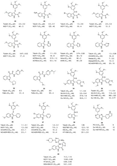 Arylthioindoles (ATIs) are a class of potent inhibitors of tubulin polymerization and cancer cell growth [62]. The ATIs inhibit tubulin assembly by interacting with the colchicine site on β-tubulin [8]. In recent years, excellent work on the optimization of the structures of ATI derivatives and SAR analyses has been reported [62,63,64,65,66,67]. For example, compounds 24 (Figure 5) and 25 (Figure 5) inhibited tubulin polymerization with IC50 values of 2.0 and 4.5 μM, respectively, and inhibited MCF-7 cell growth at nanomolar concentrations [62,63]. Some ATI derivatives bearing a halogen atom or a small-sized ether group at position 5 of the indole moiety also inhibited tubulin polymerization to a comparable level as colchicine (1) and CA-4 (11) [64]. ATI derivatives, along with the corresponding ketone and methylene compounds, were potent inhibitors of tubulin assembly with IC50 values ranging from 0.67 to 4.6 μM [65], and some compounds (26, 27 and 28) (Figure 5) inhibited human MCF-7, HeLa and HCT116/chr3 cell growth by 50% at nanomolar concentrations. ATI derivatives in which the 2-alkoxycarbonyl group was replaced with a bioisosteric 5-membered heterocycle, such as a pyrrole, furan, or thiophene moiety, not only inhibited tubulin polymerization and cancer cell growth but also exhibited high metabolic stability (29, 30) (Figure 5) [66]. ATI derivatives possessing different cyclic substituents at position 2 of the indole inhibited tubulin polymerization with IC50 values ranging from <1.0 to 2.0 μM and inhibited the growth of MCF-7 cells, with IC50 values in the nanomolar range [67]. The most potent compound 31 (Figure 5), was uniformly active in a larger panel of cancer cells, including MDR cells, and showed initial vascular-disrupting effects in a tumor model of liver rhabdomyosarcoma [67].