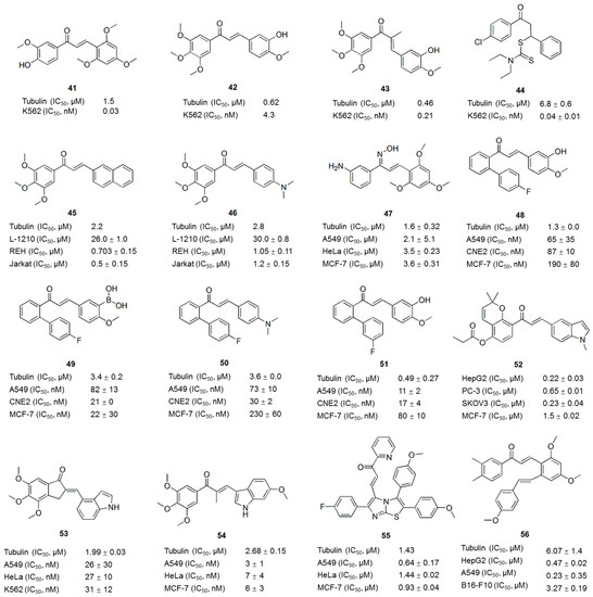 In addition to individual compound, a number of potent hybrid molecules with anticancer activities have been developed by grouping different pharmacophores [86]. For example, the hybrid of imidazothiazoles and chalcones resulted in 2,3-diaryl imidazo[1,2-b]thiazole-chalcone conjugates that exhibited significant antiproliferative activities against several cancer cells. Among these conjugates, compound 55 (Figure 6), which contains a pyridyl ring, is the most active, with IC50 values ranging from 0.64 to 1.44 μM in all tested cell lines. This compound disrupted microtubule dynamics and induced the formation of an abnormal spindle structure and centrosome by binding tubulin at the colchicine site [87]. In another study, twenty-three compounds containing a resveratrol skeleton and a chalcone moiety were synthesized. Compound 56 (Figure 6) was the most potent compound in a cytotoxicity assay, and it inhibited the growth of the cells lines HepG2, B16-F10, and A549, with IC50 values of 0.47 ± 0.02, 3.27 ± 0.19, and 0.23 ± 0.35 μM, respectively, and inhibited tubulin polymerization, with an IC50 of 6.07 ± 1.4 μM [88].