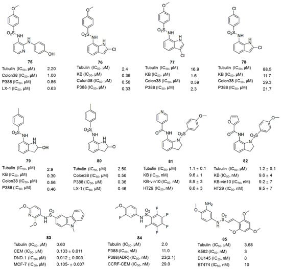 Sulfonamides possess many types of biological activities, such as antibacterial, diuretic, antidiabetic, antithyroid, antihypertensive, or antiviral activities, and have been used in clinical settings [103]. The observation that many novel sulfonamide derivatives exhibit substantial antitumor activity is particularly interesting [104,105,106]. Since the discovery of E7010 (75, Figure 10) in 1992, sulfonamides targeting tubulin have emerged as an important class of anticancer agents [107]. E7010 (75), also known as ABT-751, is an orally bioavailable sulfonamide that inhibits tubulin polymerization by binding to the colchicine site on β-tubulin. E7010 exhibited a broad spectrum of antitumor activity in vitro and in vivo [108,109] and has entered Phase II clinical trials [110]. A series of compounds were identified from sulfonamide-focused libraries based on the structure of E7010 (76–80 (Figure 10) [111,112], 81, 82 (Figure 10) [108,111,113], 83 (Figure 10) [114,115]). These compounds inhibited tubulin polymerization and induced G2/M arrest, similar to E7010 (75). Medina et al. reported a series of pentafluorobenzenesulfonamide derivatives that displayed potent antiproliferative activity against a variety of tumor cells lines, including MDR tumor cell lines [116], with the compound T138067 (84) (Figure 10) showing the best activity. Interestingly, T138067 (84) (Figure 10) disrupted tubulin polymerization by covalently modifying β-tubulin at Cys239 [117]. Recently, some novel sulfonamide-based compounds have been shown to exhibit antiproliferative activity in different human cancer cell lines, with typical characteristics of tubulin-interacting agents [118,119,120,121]. For example, 2-(N-(3-chlorophenyl)-4-methoxyphenylsulfonamido)-N-hydroxypropan-amide (MPSP-001) inhibited the growth of 12 different types of human cancer cells (IC50 values ranging from 1.9 to 15.7 μM) and tubulin polymerization by directly binding to the colchicine site of β-tubulin [119]. A screen of the anticancer activity of twenty-four compounds containing the sulfonamide scaffold led to the identification of a naphthalene sulfonamide that acts as a novel reversible antimitotic agent by interfering with tubulin polymerization, which inhibited cancer cell motility and the growth of a representative panel of human cancer cell lines, with IC50 values in the nanomolar-to-low micromolar range [120]. In addition, some novel (E)-N-aryl-2-arylethene-sulfonamides showed potent cytotoxicity against a wide spectrum of cancer cell lines (IC50 values ranging from 5 to 10 nM) by disrupting tubulin assembly [121]. Among these compounds, compound 85 (Figure 10), the most potent compound, exhibits increased blood-brain barrier permeability compared to many clinically used antimitotic agents and inhibited tumor growth in vivo. Molecules with an aryl sulfonamide moiety containing 3-hydroxy, 4-methoxy groups or 3-amino, 4-methoxy groups and a styryl ring with methoxy groups at the 2, 4, and 6 positions showed optimum biological activity in SAR studies. Furthermore, the dimethyl quinone ester, water-soluble disodium phosphate or glycine analogue of compound 85 (Figure 10) showed good activity.