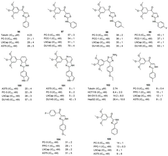 A series of 4-substituted methoxybenzoyl-aryl-thiazoles (SMART) based on the lead compound 2-arylthiazolidine-4-carboxylic acid amides (ATCAA) have been synthesized [141]. Of these SMART compounds, compound 96 (Figure 13) is a representative analogue that possesses nanomolar activity in inhibiting melanoma and prostate cancer cell growth in vitro. Based on preliminary studies, SMART compounds inhibit tubulin polymerization, effectively prevent the formation of functional microtubules and block cell mitosis. Furthermore, SMART compounds also showed great promise in overcoming Pgp mediated MDR in vitro [142]. Introducing an amino group between the A- and B-rings creates phenyl-aminothiazole (PAT); among these compounds, analogues 97, 98 and 99 (Figure 13) showed similar antiproliferative potency against cancer cells, including MDR cancer cell lines. However, the solubility and in vivo bioavailability were greatly improved compared with the SMART compounds [143]. New derivatives with modifications at the carbonyl linker of SMART and modification of the A-ring of the PAT template have been synthesized To block the metabolically labile sites on 96 (Figure 13) [144]. The SAR analysis (Figure 14) of these compounds led to the identification of new benzimidazole and imidazo[4,5-c]pyridine-fused ring templates, represented by compounds 100 and 101 (Figure 13), respectively. Both compounds showed enhanced anticancer activity and substantially improved metabolic stability in liver microsomes compared to compound 96 and stronger inhibition of tubulin polymerization compared to colchicine. In addition, a series of 4,5-diarylthiazole derivatives were synthesized based on chemical modification of CA-4 through the transformation of N and S atom in the thiazole ring, and some new microtubule-destabilizing agents were identified [145]. Compound 102 (Figure 13), which contains a 3,4,5-trimethoxyphenyl group at the C-4 position and 4-ethoxyphenyl group at the C-5 position of the 2-amino substituted thiazole, was the most potent compound against five human cancer cell lines (IC50 values of 8.4–26.4 nM) in the SAR study. Compound 102 also circumvents drug resistance, possesses high antivascular activity in vitro and significantly suppresses tumor growth in xenograft models, indicating that compound 102 is a potent microtubule-destabilizing and vascular-disrupting agent for use in cancer treatment.