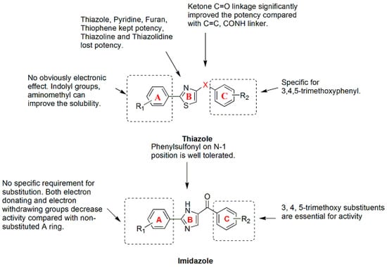 The binding of antitubulin agents regulates microtubule polymerization at high concentrations or suppresses microtubule dynamics at lower concentrations (10–100 times lower), which is the common mechanism by which these drugs block mitosis and induce cell apoptosis [6,7]. Other mechanisms of action include anti-angiogenesis activity and vascular disruption [3]. Over the last two decades, much effort has been devoted to identifying structurally diverse inhibitors of tubulin polymerization from both natural and synthetic sources. Notably, most of the known active antitubulin agents are of natural origin, characterized by a very complex structure and are difficult to synthesize and scale up. Other drawbacks of the use of tubulin inhibitors in cancer therapy include multidrug resistance (MDR), dose-limiting toxicity and poor water solubility. Thus, many studies have been performed over the years to explore new antitubulin agents inspired by natural products, which include combretastatin A-4, chalcones, phenstatins, podophyllotoxin, chalcones, taxol and vinca alkaloids. Structurally, these small active molecules have various heteroaromatic cores, such as the indole [8], benzofuran [9,10], thiazole [11,12] and imidazole [13,14,15] moieties. For many years, the potential of using colchicine binding site inhibitors (CBSIs) to overcome the clinical limitations of the available tubulin inhibitors has been recognized [16]. In this review, we will focus on novel, chemically diverse antitubulin agents targeting the colchicine binding site on tubulin.