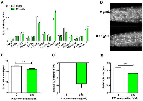 PTE reduced fat storage and modified the level of fatty acids compositions. (A) the level of fatty acids determined by thin-layer chromatography and gas chromatography (TLC/GC); (B) percentage of triacylglycerols (TAG) in total lipids (TAG + PL, phospholipids); (C) relative percentage of changed TAG; (D) Nile Red staining of fixed late L4 worms. Exposure time: 25 ms. Scale bar represents 20 μm. Data are presented as mean ± SEM of four biological independent repeats; and (E) quantification of lipid droplet size. Data are presented as ± SEM of 10 worms. Significant differences between PTE treated group (0.05 g/mL) and the control group (0 g/mL), *** p < 0.001, ** p < 0.01, * p < 0.05.