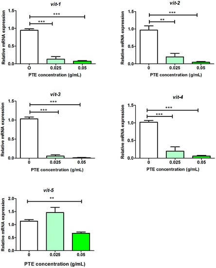 Relative mRNA expression of vit-1, vit-2, vit-3, vit-4, and vit-5 by qPCR. Data are presented as mean ± SEM of four biological repeats. Significant differences between the control group and a specific PTE treated group, *** p < 0.001, ** p < 0.01.