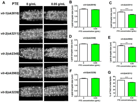 Nile Red staining of fixation and lipid droplets size of vits mutants treated by PTE. (A) Nile Red staining of late L4 worms treated with different concentrations of PTE. Presented animals, anterior is on right, and posterior is on left. Exposure time: 25 ms. Scale bar represents 20 μm; (B–F) quantification of lipid droplet size. Data are presented as ± SEM of 10 worms; and (G) percentage of TAG in total lipids (TAG + PL, phospholipids). Data are presented as mean ± SEM of four biological independent repeats. Significant differences between PTE treated group (0.05 g/mL) and the control group (0 g/mL), *** p < 0.001, ** p < 0.01.