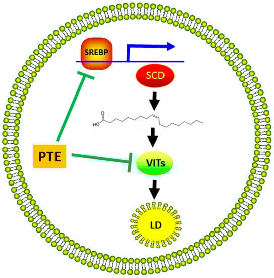 Previous studies have demonstrated that vitellogenin proteins facilitate lipids to transport and store [30,31]. Therefore, we hypothesized that vitellogenin genes may play an important role in fat storage by PTE treatment. Among the mutants of the five vit genes, vit-2(ok3211) and vit-4(ok2982) displayed similar effects to N2 when treated with PTE because the size of lipid droplet decreased (Figure 3A,C and E). Consistently, the TAG content of vit-2(ok3211) mutant quantitated by TLC/GC also decreased from PTE treatment (Figure 3G). Therefore, these two genes might not play roles in fat storage, although their transcriptional expression was inhibited under PTE treatment. In contrast, vit-1(ok2616), vit-3(ok2348), and vit-5(ok3239) mutants were unresponsive to PTE treatment, since their fat accumulation indicated by Nile Red of fixation and their lipid droplet size was not affected by PTE (Figure 3A,B,D and F). Collectively, these data suggest that the reduction of fat accumulation by PTE probably depends on the activity of VIT-1, VIT-3 and VIT-5.