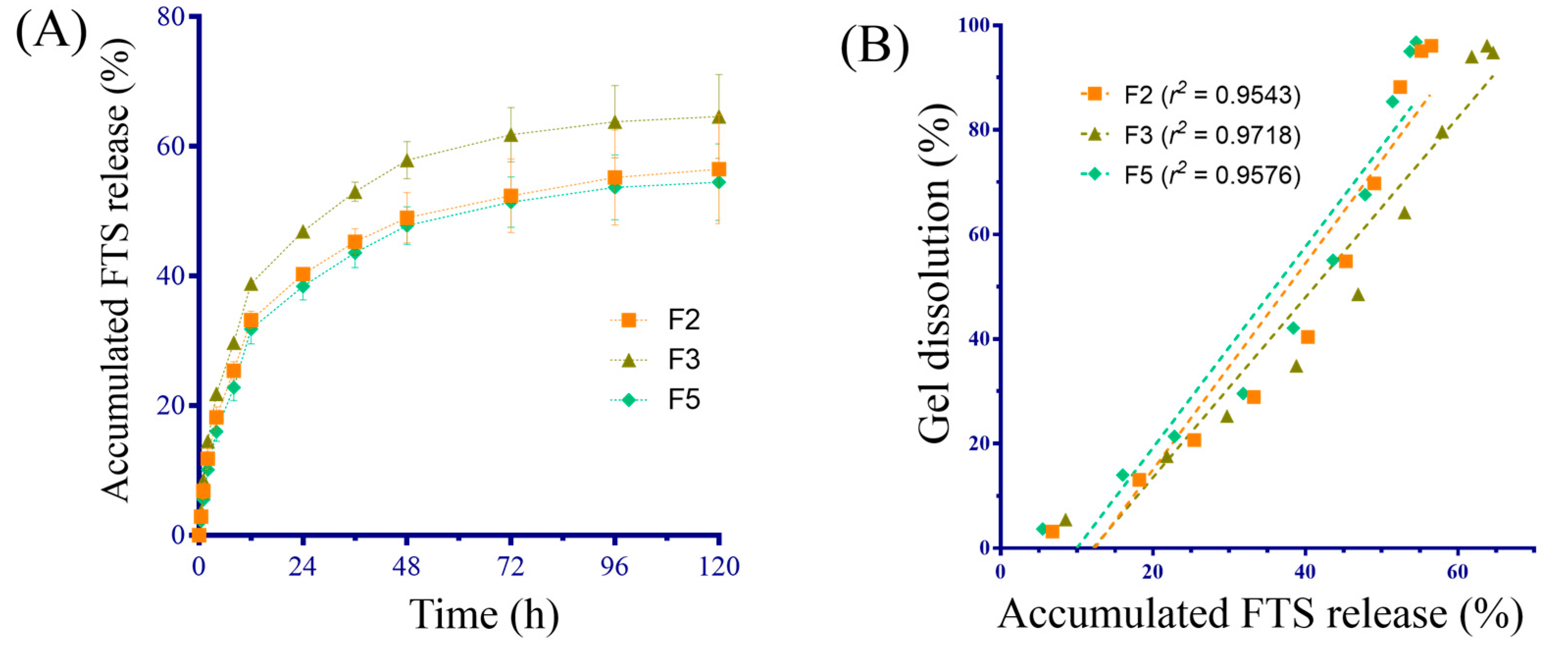 31]. Each formulation (4.0 mL) was transferred into a conical glass test tube and was incubated for 30 min in a shaking water bath (37 °C, 70 rpm) to solidify the hydrogel. An aliquot of 5 mL in phosphate buffered saline (1.0 M, pH 7.4, 37 °C) was added gently without disturbing the surface of the solidified gel. The dissolution medium was removed at predetermined time points, and the weight of the residual gel and test tube was measured. The residual gel in the test tube was refilled with fresh dissolution medium (5.0 mL) to continue dissolution. The loss of weight was calculated as the difference between the empty conical glass test tube and the tube with hydrogel to estimate the dissolution rate. The procedures for evaluating FTS release from F2, F3 and F5 were performed according to a previous report [