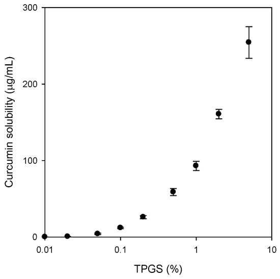 To confirm the solubility enhancement by TPGS, curcumin solubility was measured in the presence of various concentrations of TPGS. As shown in Figure 1, the aqueous solubility of curcumin was determined as 6.6 ng/mL, and this increased dramatically in a TPGS concentration-dependent manner, especially over the critical micelle concentration (CMC) of TPGS (0.05% in this study). The solubility enhancement of curcumin is affected by TPGS micelle formation [15].