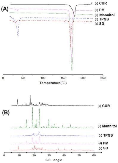 The DSC curve featured a sharp endothermic peak at around 178 °C, 170 °C and 39 °C corresponding to melting point of curcumin, mannitol and TPGS, respectively, indicating their crystalline nature (Figure 3A-(a,c,d)) [1,23,24,25,26]. The DSC thermograms of the physical mixture (Figure 3A-b) and solid dispersion (Figure 3A-e) displayed similar patterns, i.e., disappearance of the endothermic peak of curcumin and reduced endothermic peak of mannitol and TPGS. These results might be attributed to curcumin dissolving in the molten TPGS and mannitol during DSC measurement [20,27].