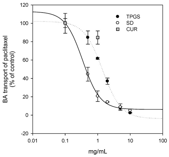 To investigate the P-gp modulation by the solid dispersion formulation, P-gp-mediated paclitaxel efflux (i.e., B to A transport rate of paclitaxel in this study) in P-gp overexpressed LLC-PK1-P-gp cells was measured in the presence of curcumin, TPGS, and its solid dispersion formulation [30]. As shown in Figure 8, curcumin, TPGS, and the solid dispersion formulation inhibited P-gp-mediated B to A transport of paclitaxel in a dose-dependent manner. Comparison of the inhibitory potencies of 1 mg/mL curcumin and TPGS showed that they inhibited paclitaxel transport by 16.4% and 38.4%, respectively. However, the presence of solid dispersion formulation inhibited paclitaxel transport by 79.3%. The IC50 values for the inhibition of B to A transport of paclitaxel were calculated as 1.4 mg/mL for TPGS and 0.35 mg/mL for the solid dispersion formulation, suggesting the enhancement of P-gp inhibitory potency by the solid dispersion formulation. The IC50 value of curcumin could not be calculated because of its solubility problem.