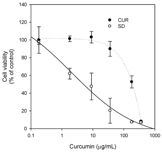 The effect of curcumin (CUR, ●) or solid dispersion formulation (SD, ○) on viability of MDA-MB-231 cells. MTT assay was performed after 24 h incubation in the presence of curcumin (0.18, 1.8, 9, 36, 180 and 360 μg/mL), 10-fold amount of TPGS, and their solid dispersion formulation. Each data point represents the mean ± S.D. of three independent experiments.