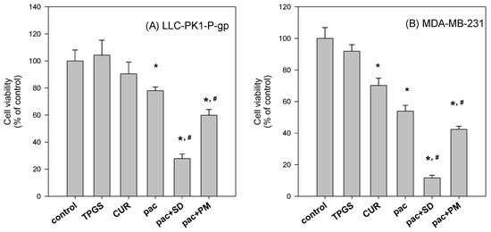 The differential anti-proliferative effect of solid dispersion formulation from physical mixture in LLC-PK1-P-gp (A) and MDA-MB-231 cells (B). LLC-PK1-P-gp and MDA-MB-231 cells were grown in 96 well plates (104 cells/well) and incubated with paclitaxel (pac; 500 nM) in the absence and presence of solid dispersion (SD; curcumin:TPGS:mannitol = 0.09:0.9:1.35 mg/mL), and physical mixture (PM) for 2 h. For comparison, curcumin (CUR; 0.09 mg/mL) and TPGS (0.9 mg/mL) were also incubated for 2 h. After the 2 h incubation, the medium was replaced with fresh medium and incubated for 22 h. MTT assay was performed after 24 h incubation. * p < 0.01, statistically significant compared with control group. # p < 0.01, statistically significant compared with paclitaxel treatment.