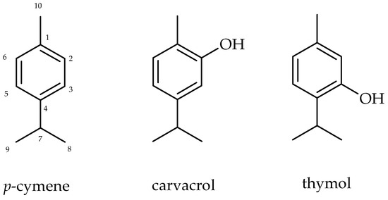 Structure of monoterpenes p-cymene, carvacrol and thymol.