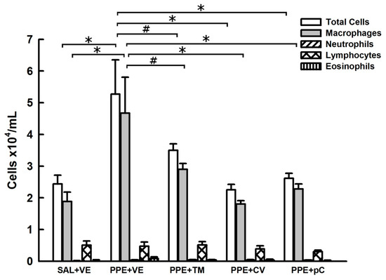 Effects of monoterpenes p-cymene, carvacrol and thymol on lung inflammation. Data are presented as mean ± standard error (SE) (n = 7 to 8 mice/group) of number of cells recovered in bronchoalveolar lavage fluid collected at the 28th day of the experimental protocol. SAL + VE: control group with vehicle treatment; PPE + VE: porcine pancreatic elastase instillation and vehicle treatment; PPE + TM: porcine pancreatic elastase instillation and thymol treatment; PPE + CV: porcine pancreatic elastase instillation and carvacrol treatment; PPE + pC: porcine pancreatic elastase instillation and p-cymene treatment. * p < 0.01 and # p < 0.05.