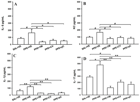 To investigate the role of tested monoterpenes in modulating the secretion of cytokines in BALF, the levels of IL-6 (Figure 3A); KC, which is homologous to IL-8 in humans (Figure 3B); IL-1β (Figure 3C); and IL-17 (Figure 3D) were measured using ELISA. The PPE + VE group showed higher levels of IL-6 (p < 0.05), KC (p < 0.05), IL-1β (p < 0.001) and IL-17 (p < 0.01) compared to SAL + VE group. Moreover, the treatment with monoterpenes p-cymene, carvacrol and thymol reduced the levels of these cytokines in a similar mode to those observed in SAL + VE group (IL-6: p < 0.01; KC: p < 0.05; IL-1β and IL-17: p < 0.001 for the three treatments). Notwithstanding, the levels of IL-17 in thymol treated animals were also reduced in comparison to control animals (p < 0.05).