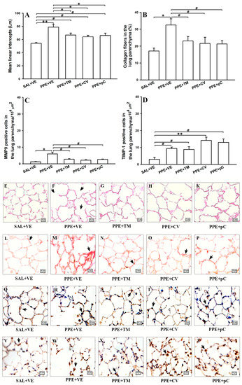 Effects of monoterpenes thymol, carvacrol and p-cymene on alveolar septa. Data are presented as mean ± standard error (SE) (n = 5 mice/group) of: mean linear intercepts (Lm) (A); volume proportion of collagen fibers (B); and the number of positive cells to MMP-9 (C); and TIMP-1 (D) in lung of mice in the 28th day of the protocol. The photomicrographs represent the lung tissue of one animal from control (E,L,Q,V), PPE treated with vehicle (F,M,R,W) and PPE treated with thymol (G,N,S,X), carvacrol (H,O,T,Y) or p-cymene group (K,P,U,Z) stained with HE (first line), picro-sirius to detect collagen fibers (second line), by immunohistochemistry to MMP-9 and TIMP-1 (third and fourth line respectively). Arrows indicate lung emphysema, collagen deposition and positive cells. SAL + VE: control group with vehicle treatment; PPE + VE: porcine pancreatic elastase instillation and vehicle treatment; PPE + TM: porcine pancreatic elastase instillation and thymol treatment; PPE + CV: porcine pancreatic elastase instillation and carvacrol treatment; PPE + pC: porcine pancreatic elastase instillation and p-cymene treatment. * p < 0.01, ** p < 0.001 and # p < 0.05.