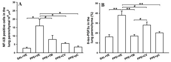 Figure 2 shows the number of total cells as well as the number of macrophages, neutrophils, lymphocytes, and eosinophils recovered in BALF. The PPE instillation increased inflammatory cells in BALF, particularly macrophages, compared to SAL + VE group (p < 0.01 for both comparisons). The treatment with monoterpenes p-cymene, carvacrol and thymol reduced the number of total cells and macrophages (PPE + CA and PPE + pC, p < 0.01 and PPE + TM, p < 0.05) in BALF compared to values obtained in PPE + VE group. No differences were detected in the number of neutrophils, lymphocytes and eosinophils among the experimental groups.