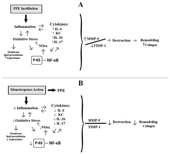 Monoterpenes probably mechanism is related to reduction in inflammation, oxidative stress and in NF-κB in lung of PPE-instilated animals. (A) The PPE instillation induces inflammation and increase marker of oxidative stress. Cytokines such as IL-6, KC, IL-1β and IL-17 are released and induce the perpetuation of inflammation. Together with oxidative stress, there is activation in NF-κB pathway, which in turn up-regulated transcription of proinflammatory cytokines and iNOS, that can induce an increase in exhaled nitric oxide. Augment in MMP-9 positive cells can amplify inflammation and contribute to the destruction of lung tissue culminating with collagen fibers deposition; (B) The administration of monoterpenes led to a reduction of the inflammatory process and consequent reduction in oxidative stress, which is related to the effects of monoterpenes in cytokines reduction (IL-6, KC, IL-1b and IL-17), NF-κB and isoprostane. These anti-inflammatory and antioxidant effects contributed to reduction in tissue destruction.