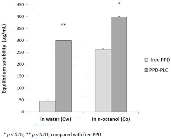 Equilibrium solubility studies of free PPD and PPD-PLC were conducted in water (Cw) and in n-octanol (Co) (Figure 9). The average equilibrium solubility of PPD-PLC in water (299.40 ± 5.65 μg/mL) was 6.53-times that of free PPD (45.83 ± 0.57 μg/mL); whereas the solubility of PPD-PLC in n-octanol (398.45 ± 1.20 μg/mL) was 1.53-times that of free PPD (261.15 ± 0.35 μg/mL). This strongly suggested that the phospholipid complex could significantly promote the hydrophilicity (p < 0.01) and lipophilicity (p < 0.05) of the free drug.