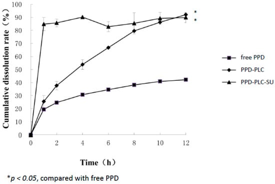 The dissolution curves of free PPD, PPD-PLC and PPD-PLC-SU are shown in Figure 10. Only 42.2% of the free PPD dissolved in 12 h could be distinguished, but nearly 80% of PPD-PLC had dissolved within the same time. The dissolution rate of PPD-PLC was obviously much higher than that of free PPD. However, approximately 85% of PPD-PLC-SU dissolved in the first hour, and the final dissolution extent remained approximately at 90%.