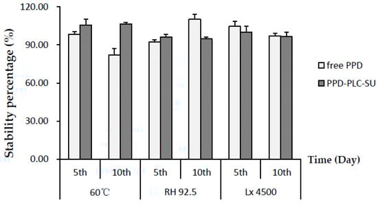 In our previous study [25], the stability of free PPD was revealed to be relatively sensitive to high temperature (≥40 °C). The results of the stability investigation on free PPD and its final formulation PPD-PLC-SU are shown in Figure 11. The DL percentage of PPD-PLC-SU (at the fifth and 10th day) were not influenced by high temperature (60 °C) and remained remarkably stable, compared with the percentage at zero days. Therefore, it indicated that the stability of PPD-PLC-SU was higher than free PPD under high temperatures. In high humidity, the stability of PPD-PLC-SU was shown to be a little lower than that of free PPD at the 10th day, which might be that the large amount of excipients in PPD-PLC-SU more easily become hygroscopic than free PPD when exposed to humid environments. It also showed that strong irritation had little effect on the stability of free PPD or PPD-PLC-SU at the fifth or 10th day. However, some results in the temperature-stability investigation slightly exceeded 100% (shown in Figure 11), which might be related to the moisture loss of the excipients in PPD-PLC-SU because of the drying process (60 °C) and measurement errors.