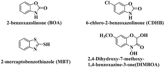 - Fomsgaard, I.S.; Mortensen, A.G.; Carlsen, S.C.K. Microbial transformation products of benzoxazolinone and benzoxazinone allelochemicals––A review. Chemosphere 2004, 54, 1025–1038. [Google Scholar] [CrossRef] [PubMed]